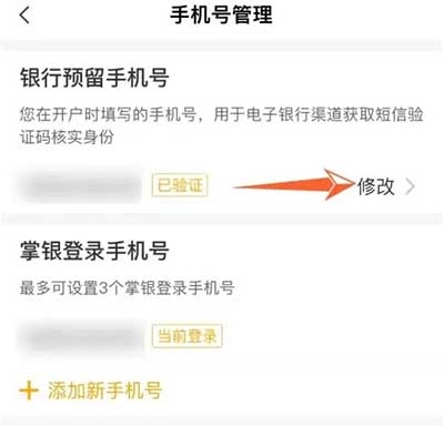 通过手机号管理功能修改预留手机号需要登录掌银后才能使用。同时提示预留手机号及登录手机号都必须输入本人名下的手机号,会校验运营商的实名信息,对手机号修改均需验证短信验证码、人脸验证和手机号三要素核验。