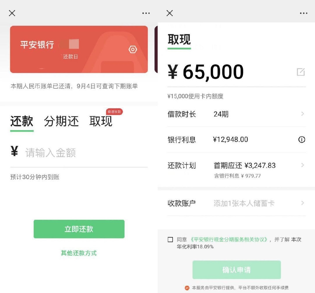 微信的页面和服务协议显示,这一服务由银行方面提供。虽然微信信用卡取现免收手续费,但是额度和利率都由银行审核决定,互联网平台不额外收取任何费用。持卡人可在发卡机构给予的取现额度内使用信用卡取现服务,可选择单月还和分月还两种类型。